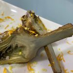 Alcachofas a baja temperatura con jengibre, cítricos y jamón ibérico