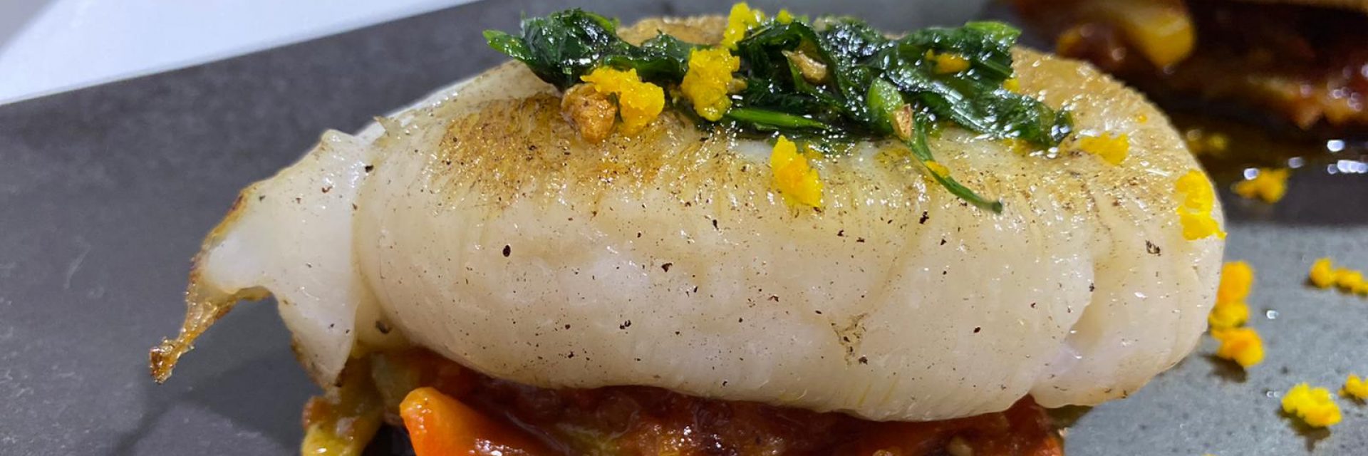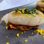 Huevas de sepia con pisto de calabacín