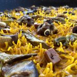 Fideua de spaghetti roto con pato, alcachofas y foie